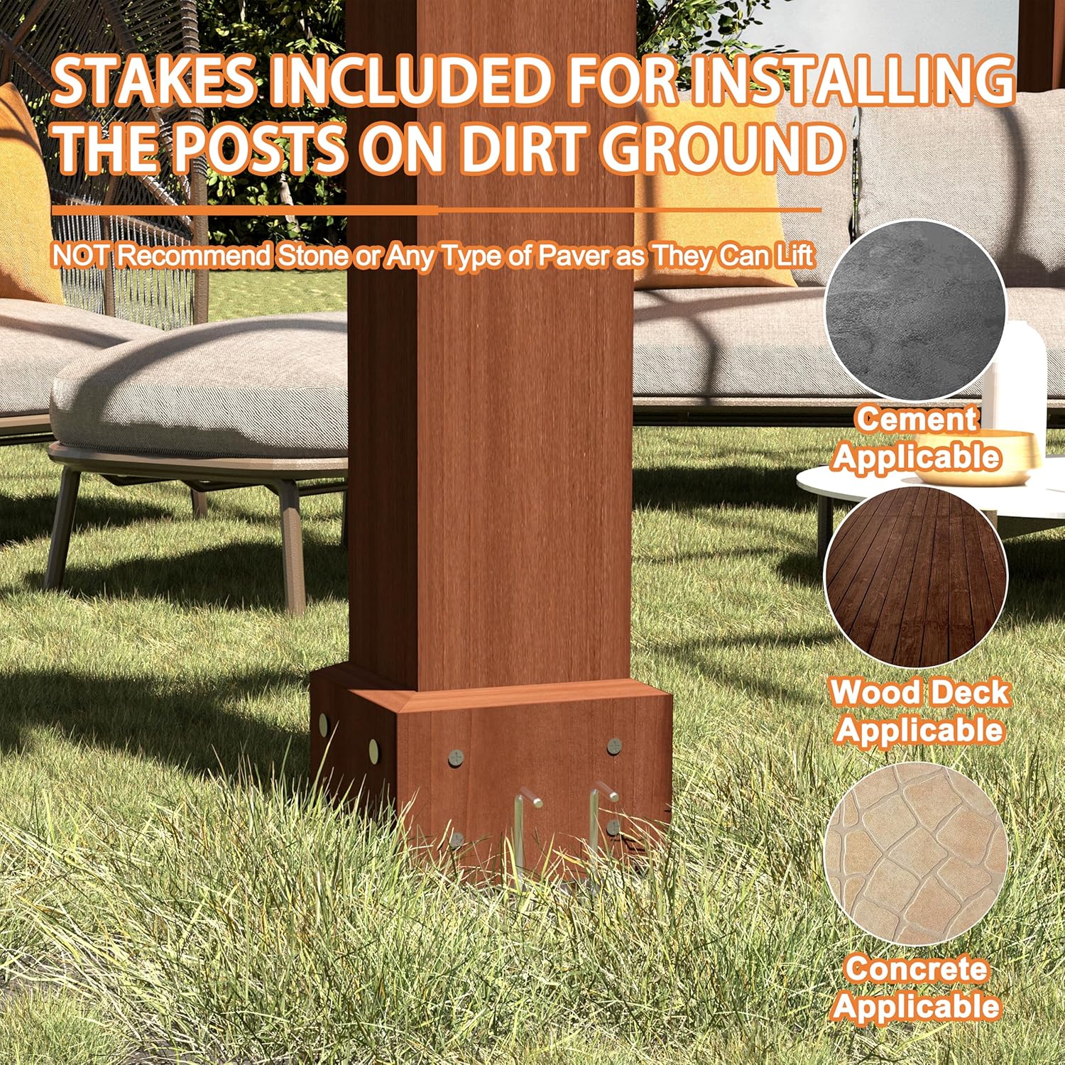 - Strong Stability: This pergola pavilion features ground piles for added stability, allowing you to secure it to various surfaces such as cement, concrete, or wood decks. Perfect for patios, backyards, and more, it’s ideal for hosting outdoor gatherings, relaxing in the shade, or having afternoon tea.