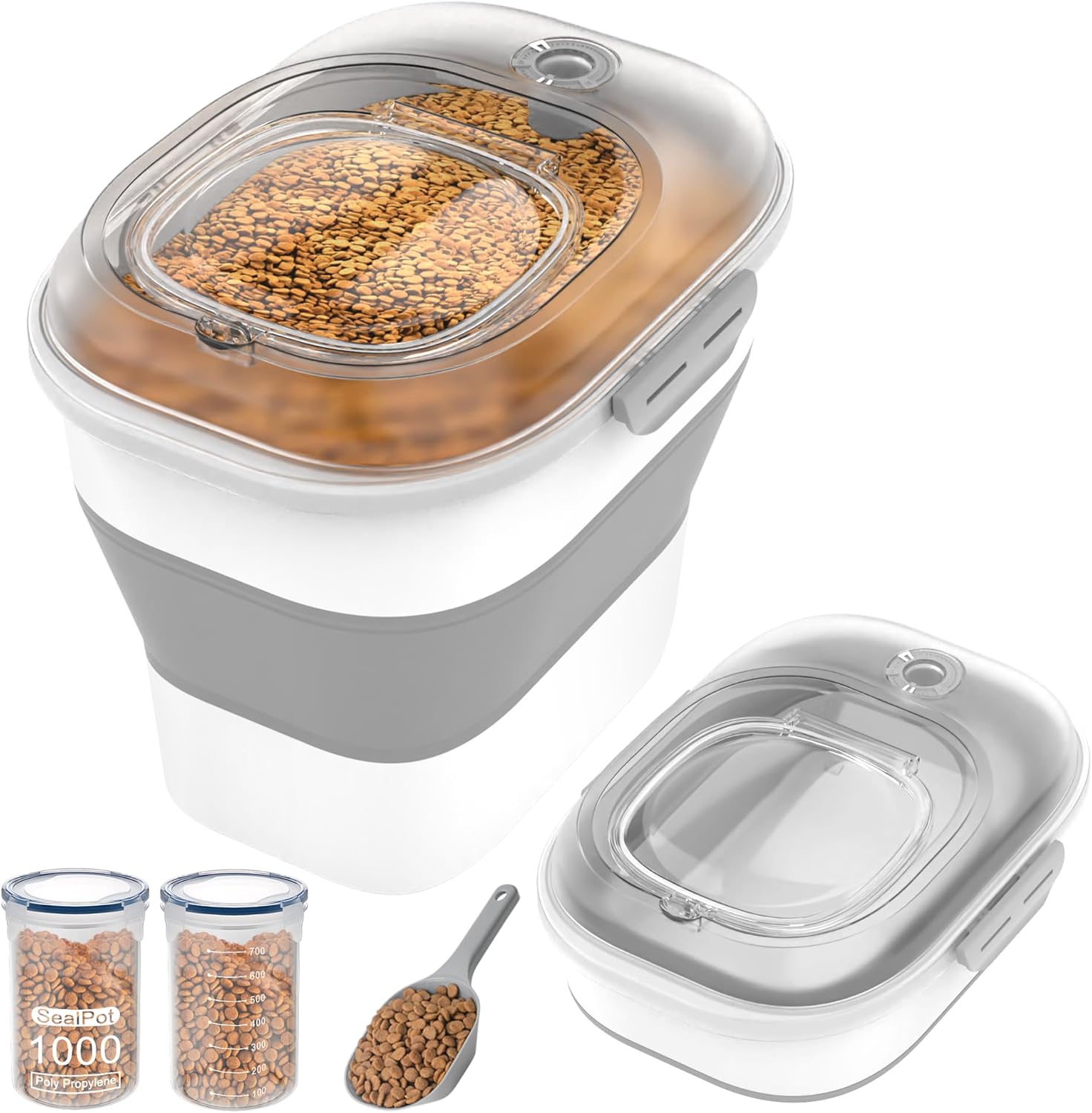 32-35 Lbs Dog Food Storage Container,Collapsible Dog Food Container with Transparent Airtight Lid,Wheels,Date Track,Pet Food Storage Container for Rice,Flour,Sugar,Scoop And 2PCS Containers