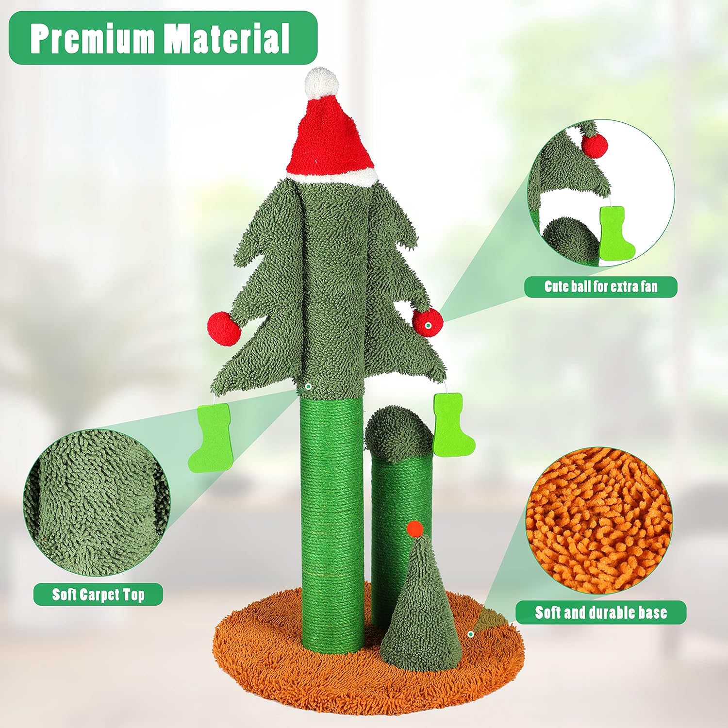 32” Cat Scratching Post, Tall Christmas Tree Cat Scratcher with 3 Posts and Cute Dangling Teaser Balls, Natural Sisal Rope Cat Toys for Kitty and Adult Cats