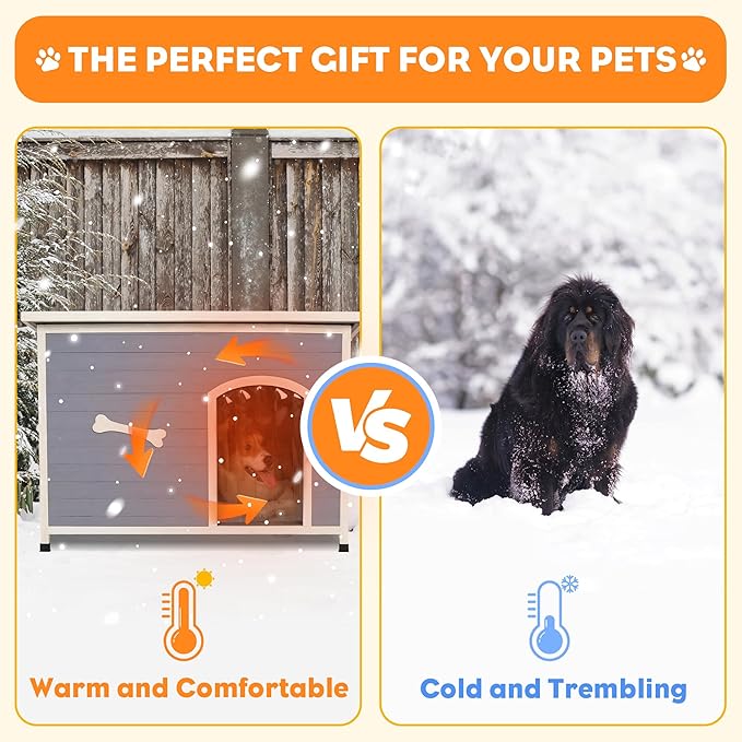- [Specially Designed for Outdoor Use] The sloping asphalt roof is expertly engineered to prevent rainwater from pooling, ensuring that your pet's living space remains dry and comfortable. The floor is 2.4’’ above the ground, and there is a removable PVC curtain and adaptable floor pads for uneven ground. This design enables the dog house to withstand harsh weather conditions, preventing water from seeping in and materials from getting damp