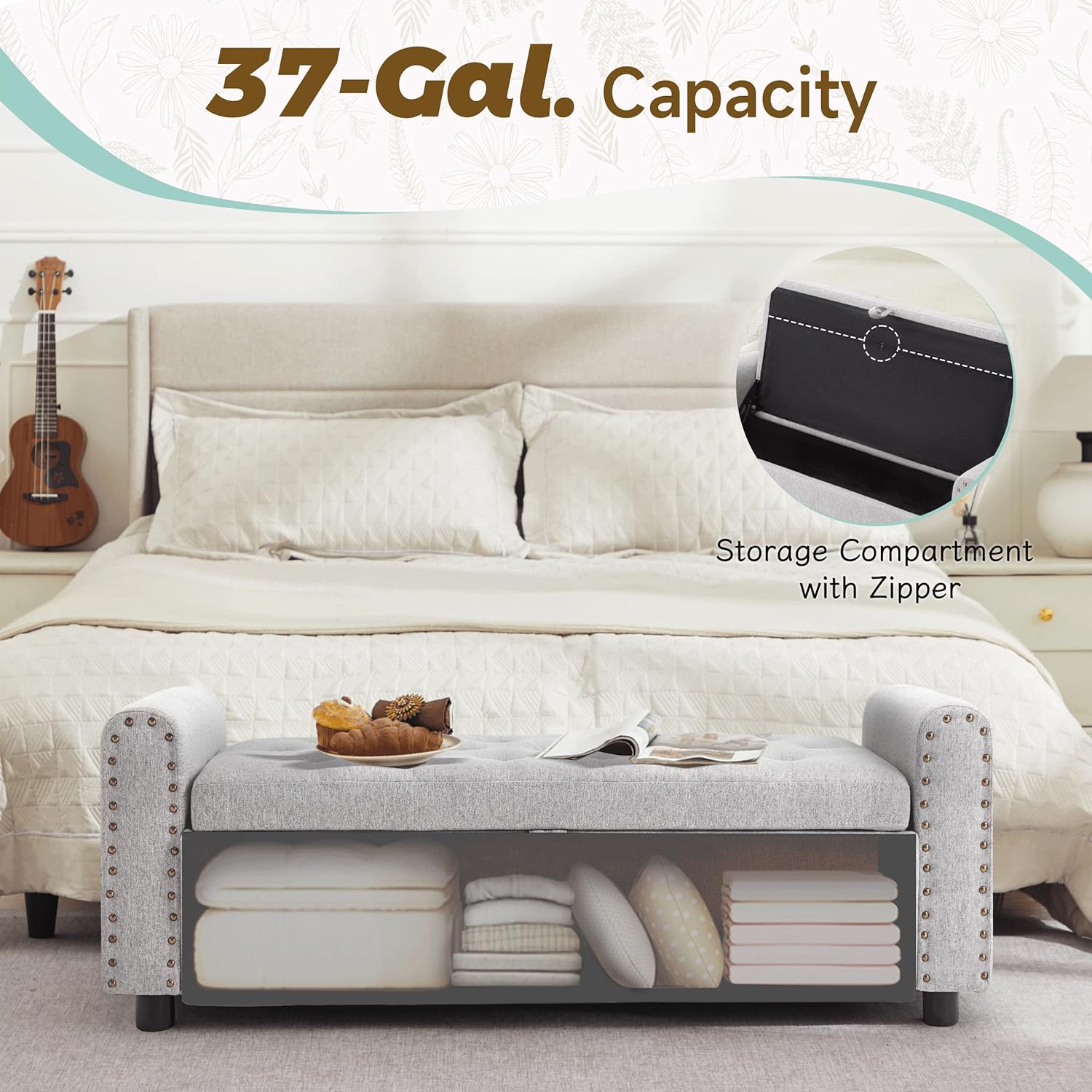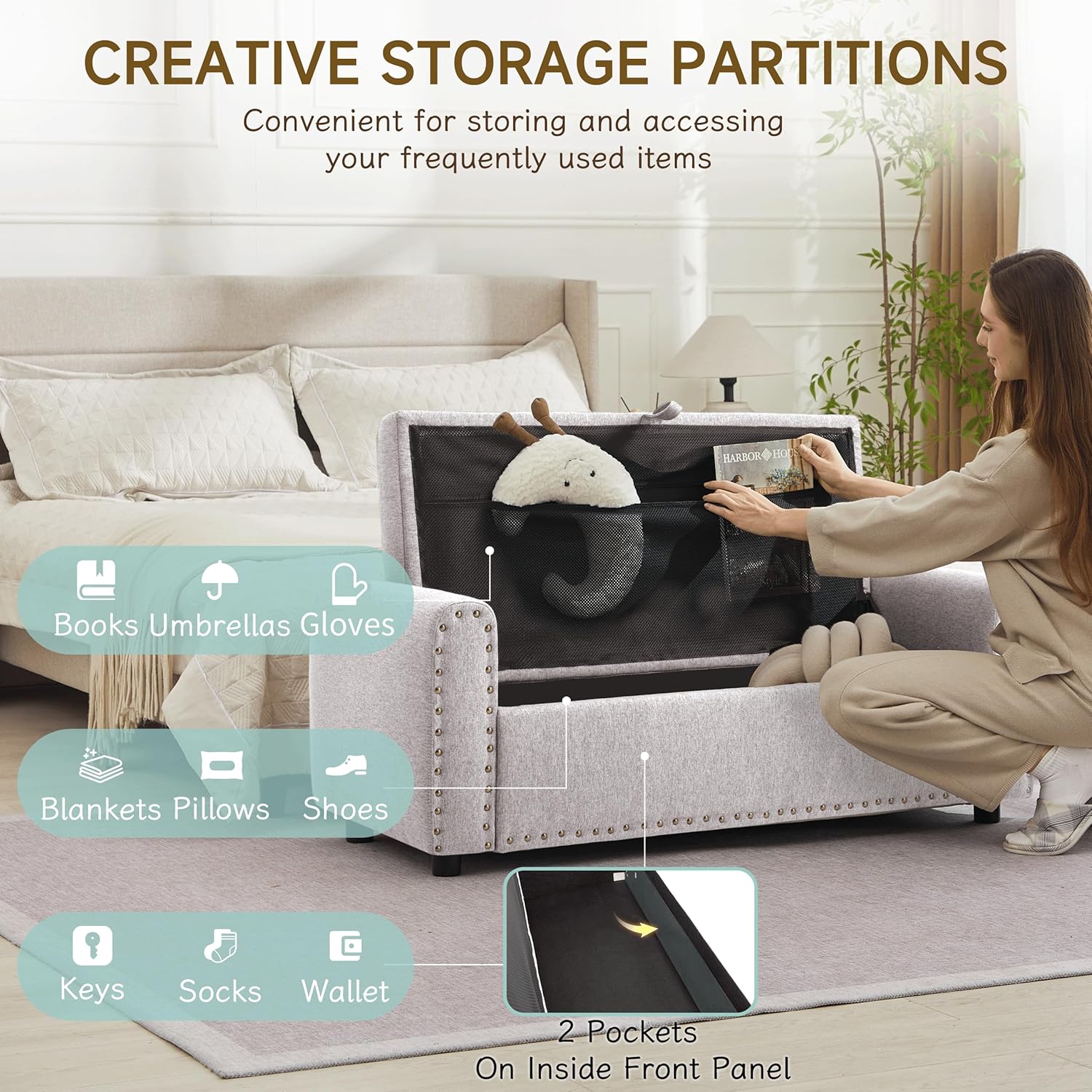 - 𝐈𝐧𝐭𝐞𝐫 𝐅𝐫𝐨𝐧𝐭 𝐏𝐨𝐜𝐤𝐞𝐭 𝐟𝐨𝐫 𝐄𝐚𝐬𝐲 𝐀𝐜𝐜𝐞𝐬𝐬 𝐭𝐨 𝐄𝐬𝐬𝐞𝐧𝐭𝐢𝐚𝐥𝐬-Our storage bench has a larger capacity of 37 gallons, allowing you to store more items. In addition, it features creative and thoughtful designs that take everyday usability in mind. Inside the front panel, you’ll find 2 pockets—perfect for stashing items you need often, like socks, remote controls, keys, or earbuds. No need to dig through everything to grab what you use most.