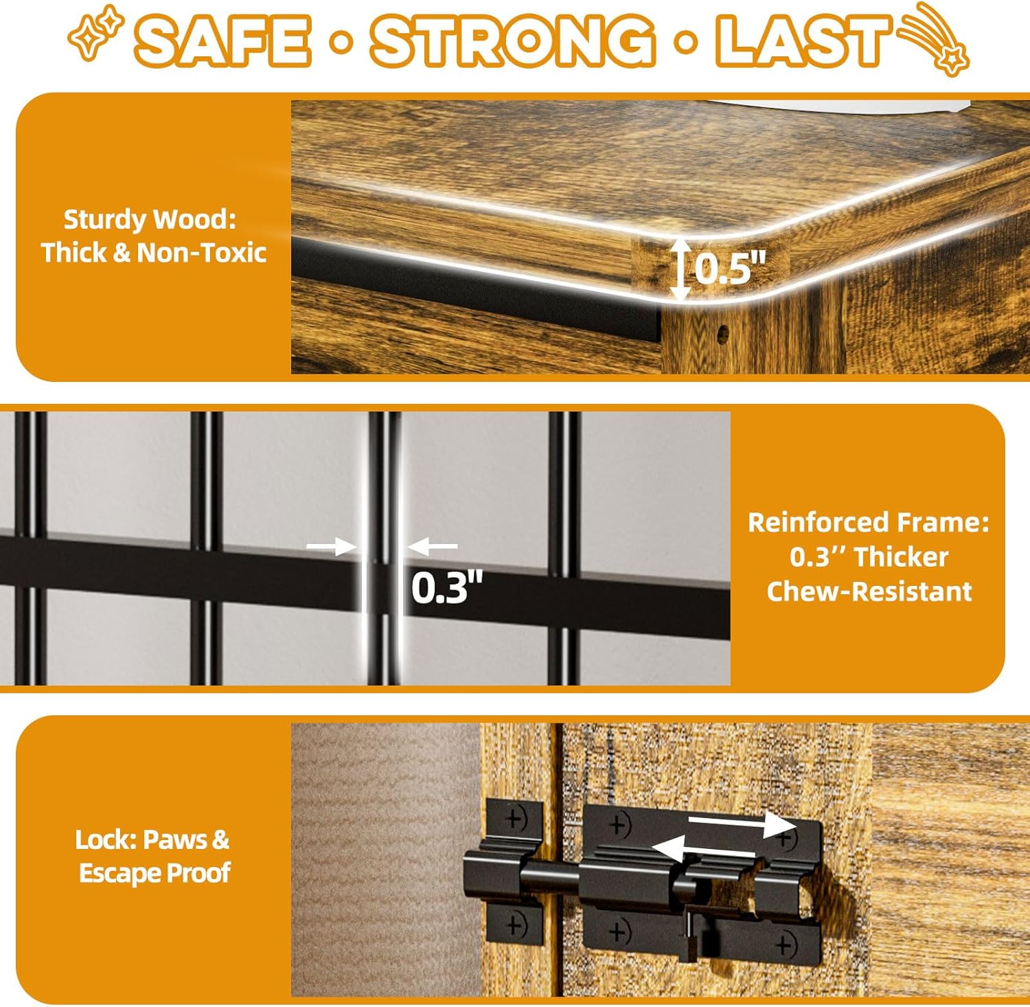 • Chew-Resistant & Durable Structure: Built with 0.3" reinforced steel bars and a 0.5" thick solid wood base. Supports long-term use without warping or breaking—even with energetic large dogs